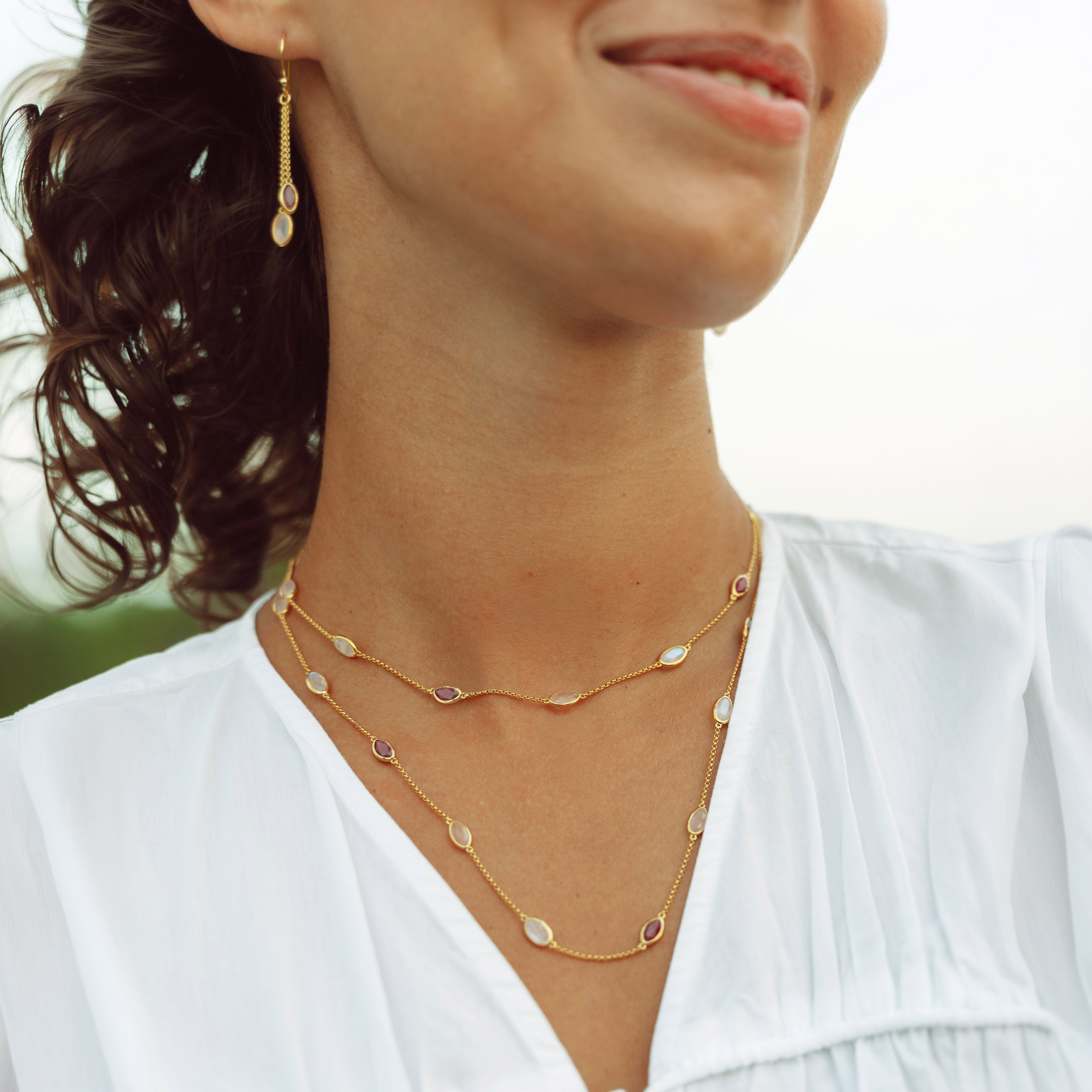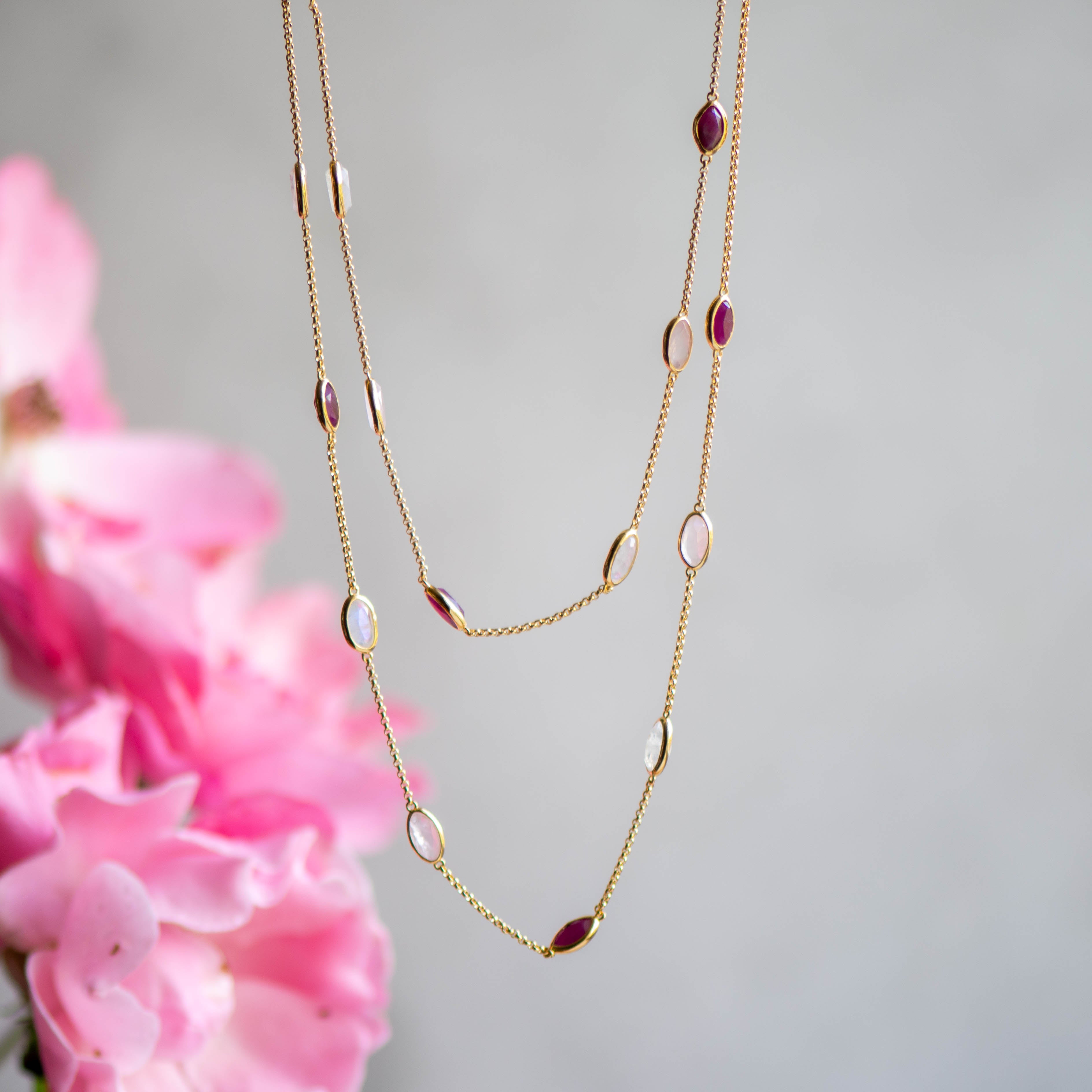 Double Lola Necklace in Gold with Ruby, Rose Quartz and Moonstone