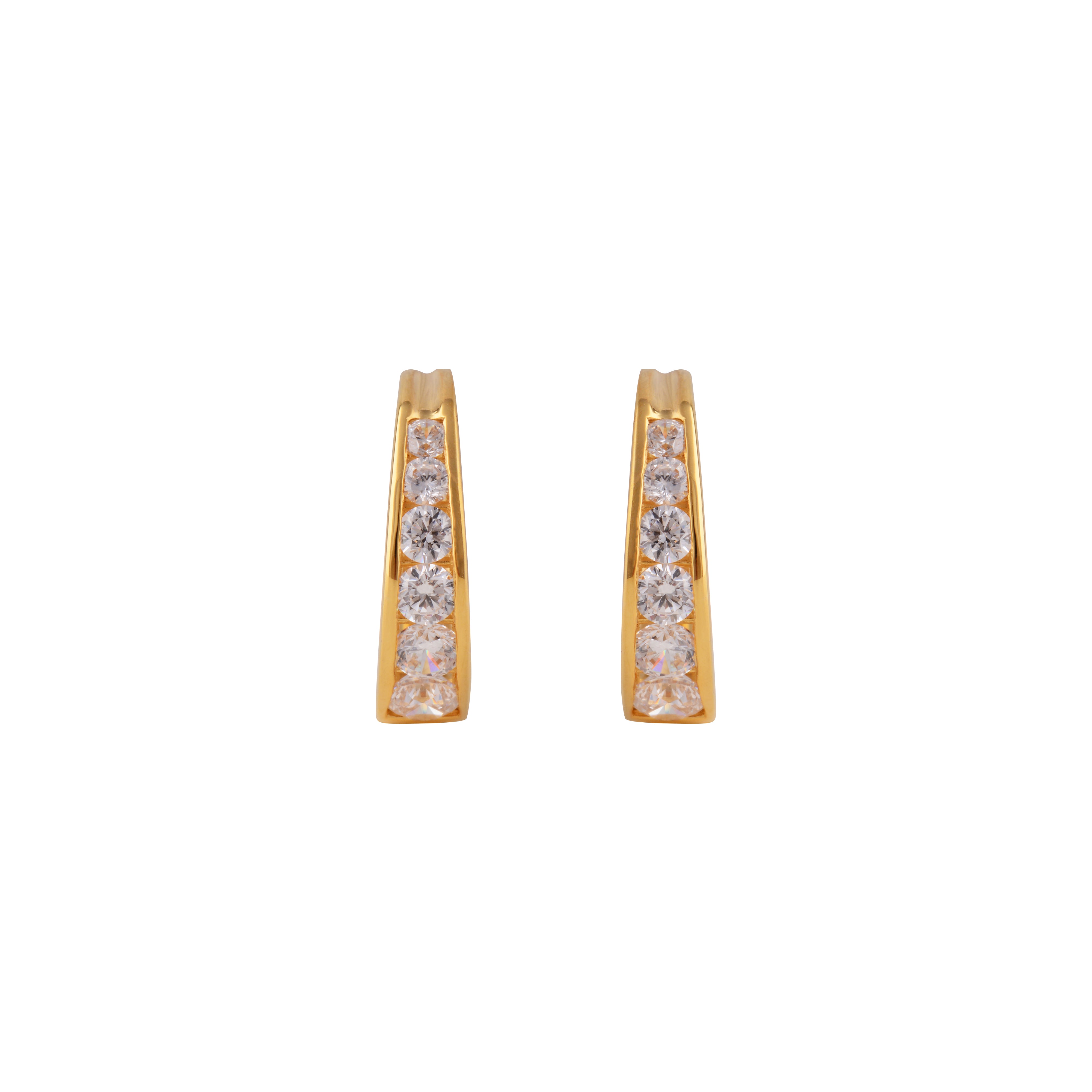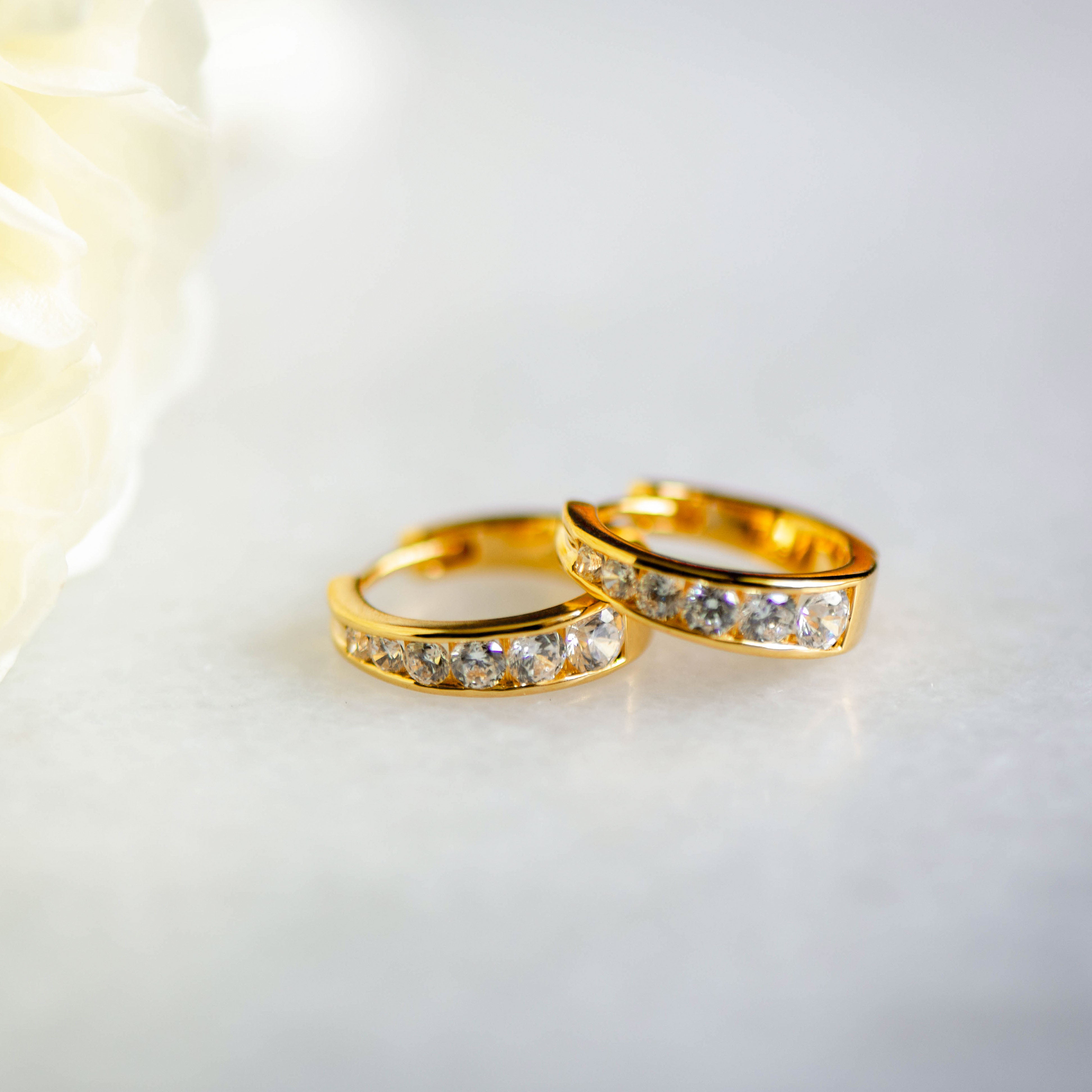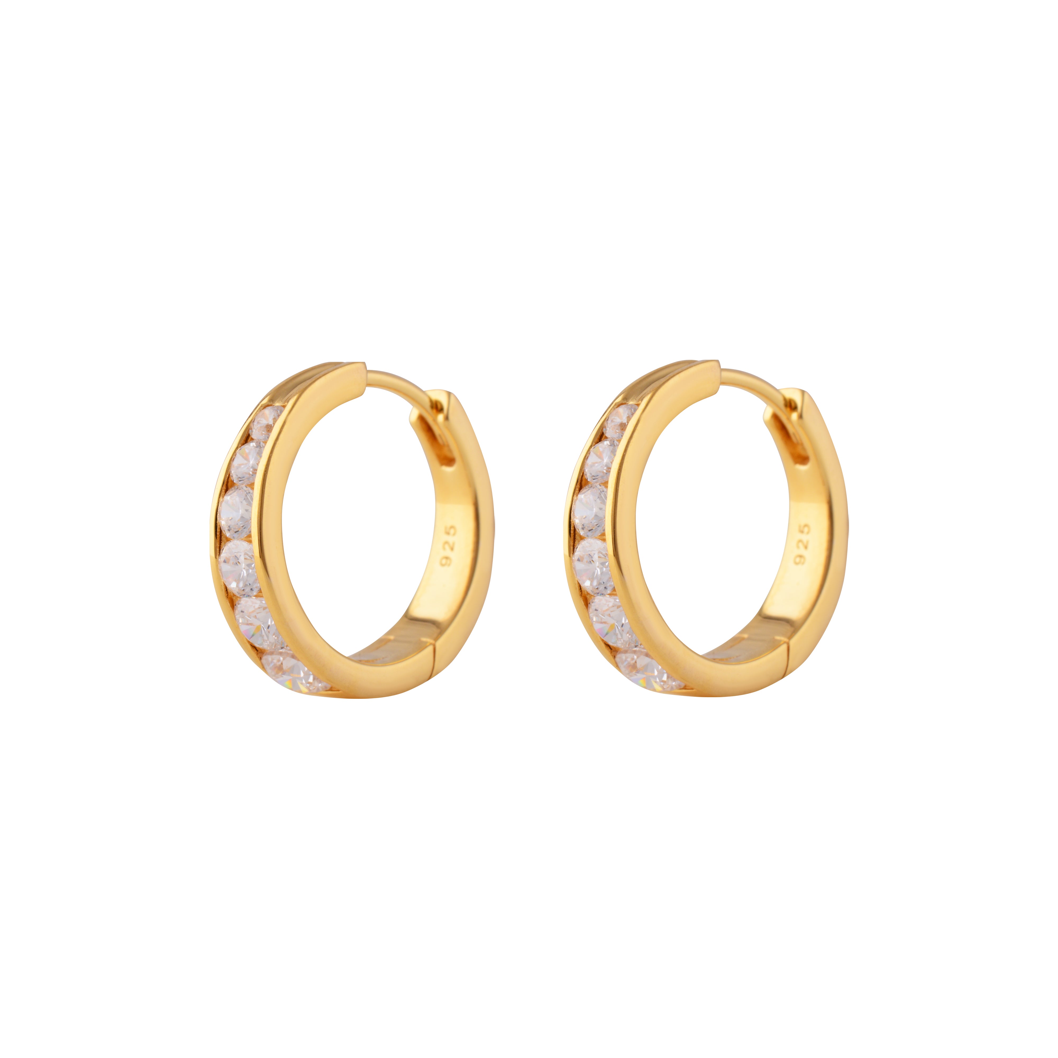 Our perfectly sized Brooklyn hoops. Gold curves hosting a tiny constellation of gemstones giving some champagne-level shine.