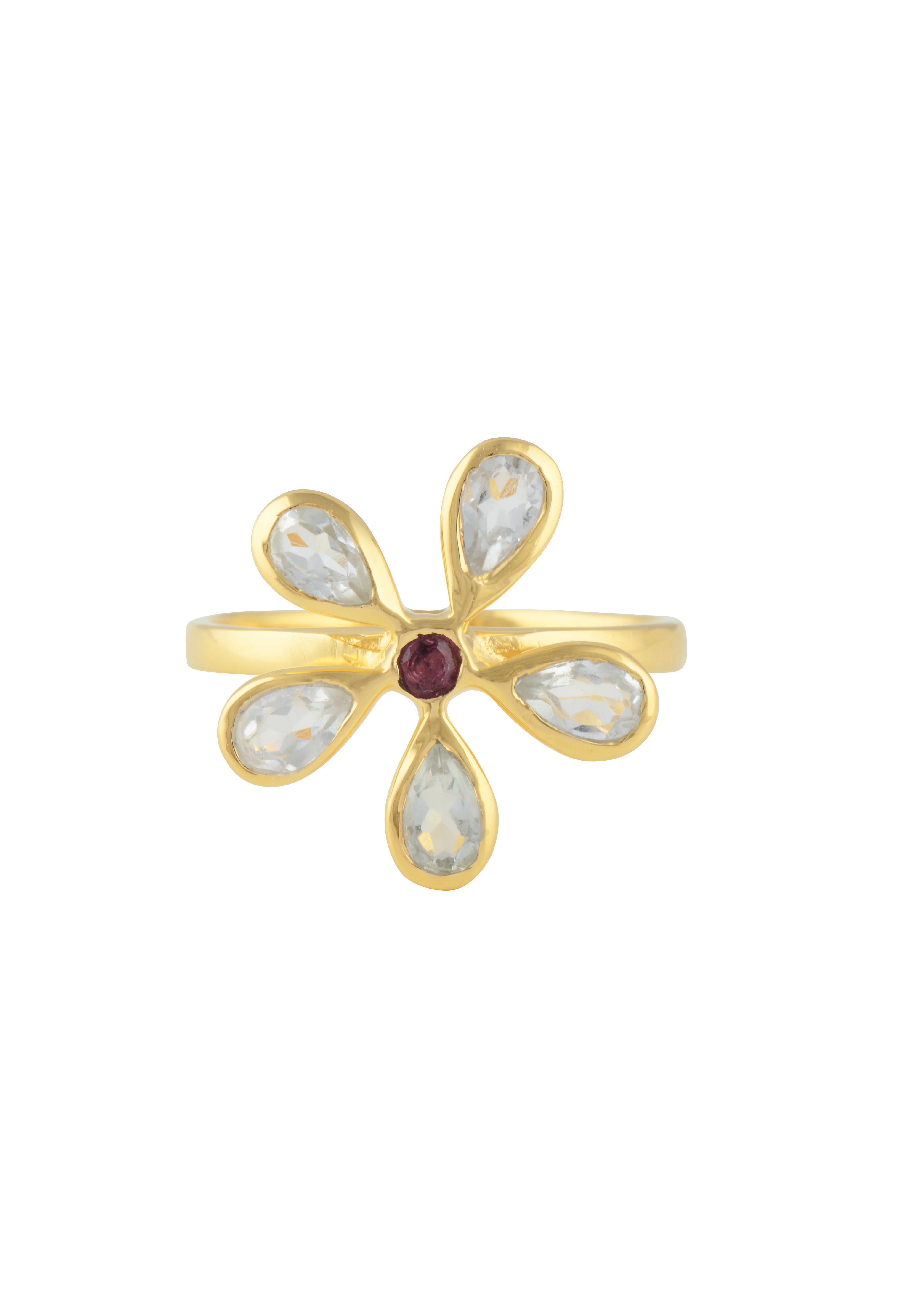 If you're a daisy lover, this ring will steal your heart! Delicately handcrafted, it features five pear-shaped green amethyst gemstones playfully encircling a vibrant red garnet.