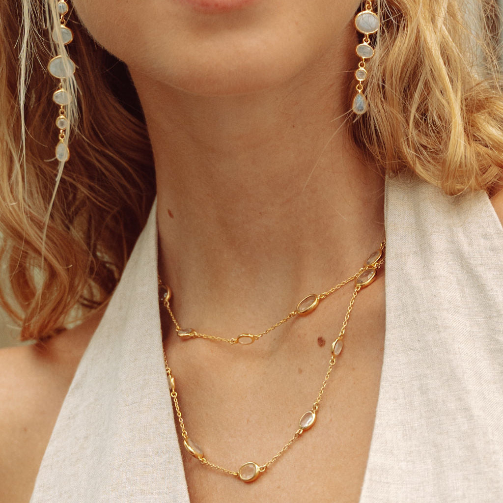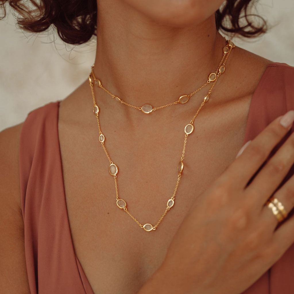 Glamorous, stylish and eye catching. This beautiful double Marilyn necklace in gold with crystal can be worn long or wrapped around for a layered look. The crystal stones vary in size.