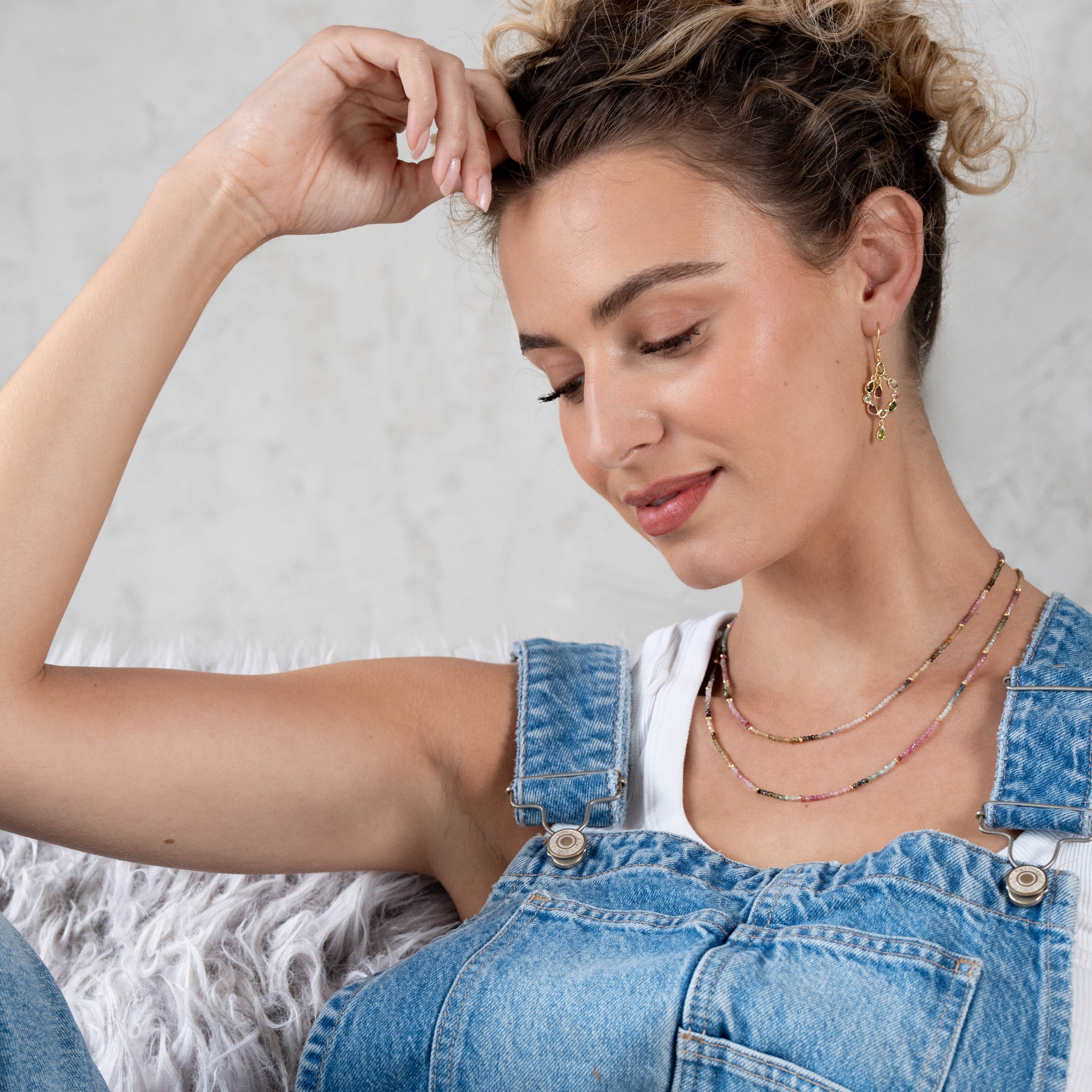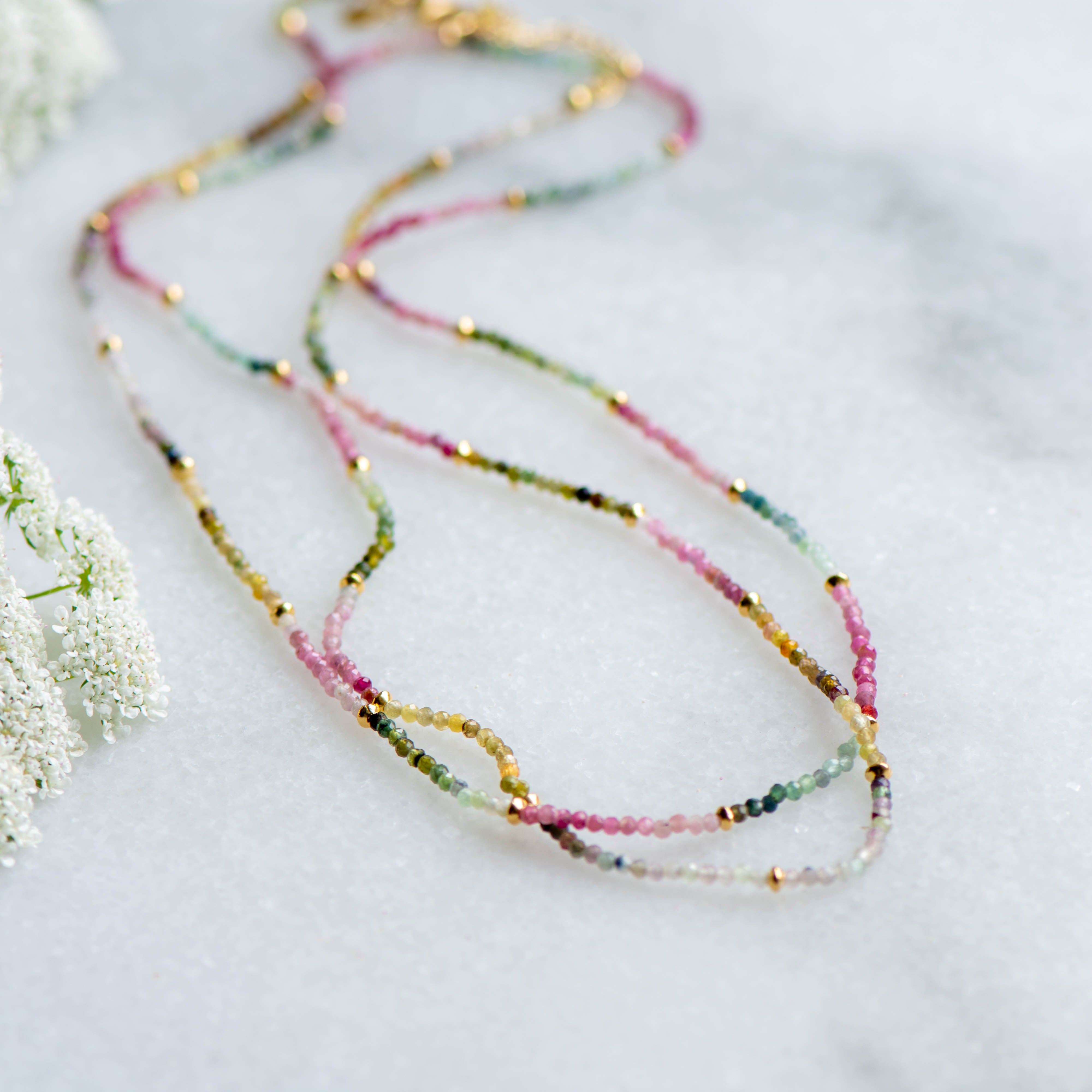 A double string of tourmaline beads interspersed with gold balls. Tourmaline is a vibrant, protective stone known for its ability to ground energy and inspire confidence through its wide spectrum of colours.