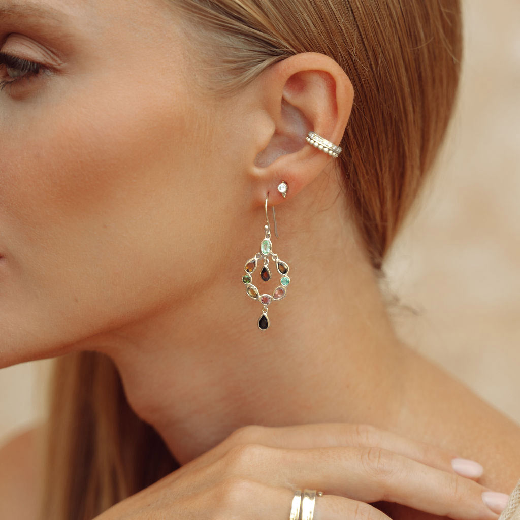 Our Dream Catcher earrings are captivating. They have an oval design with eight tourmaline stones in circular and teardrop shapes, finished with a teardrop stone hanging in the center and at the bottom.