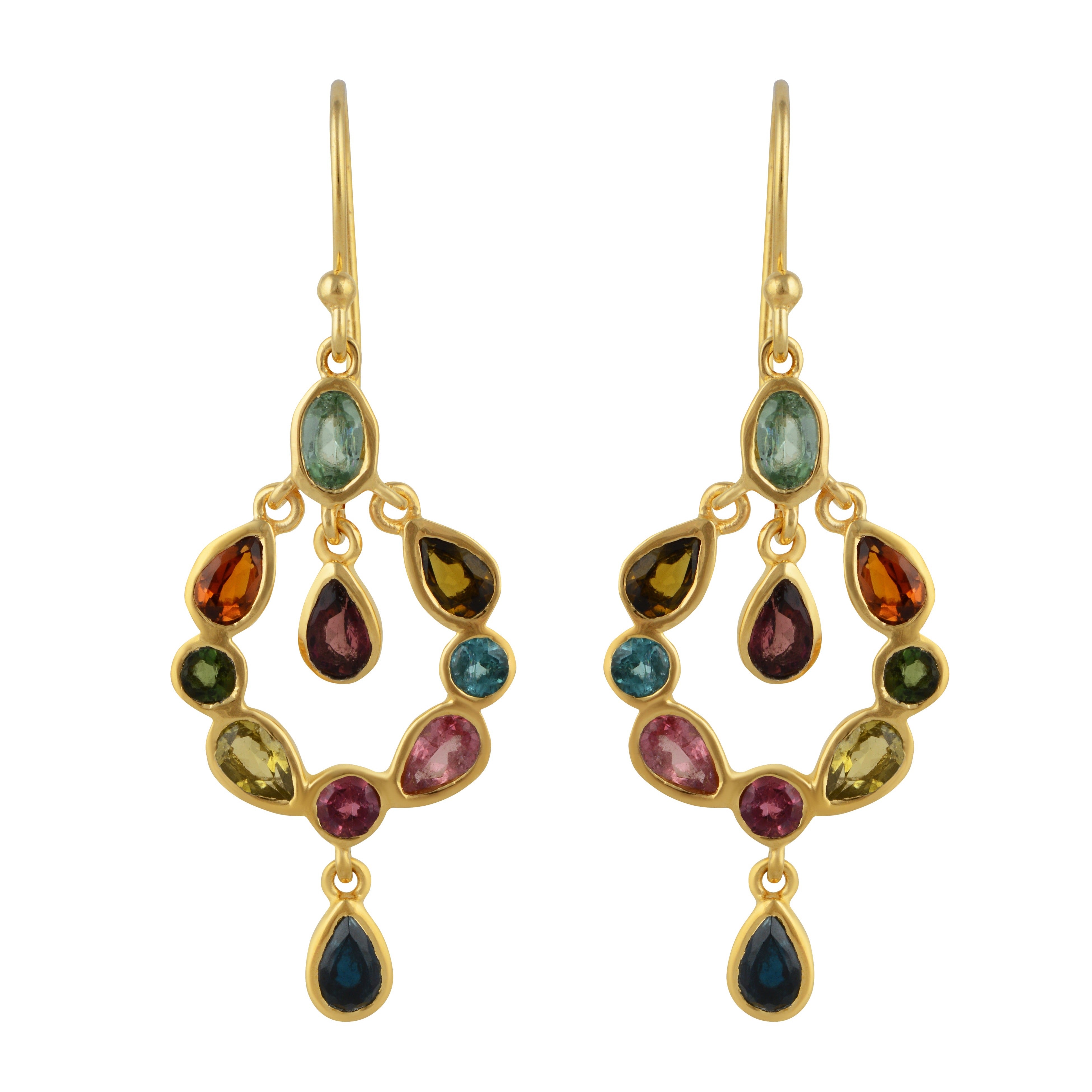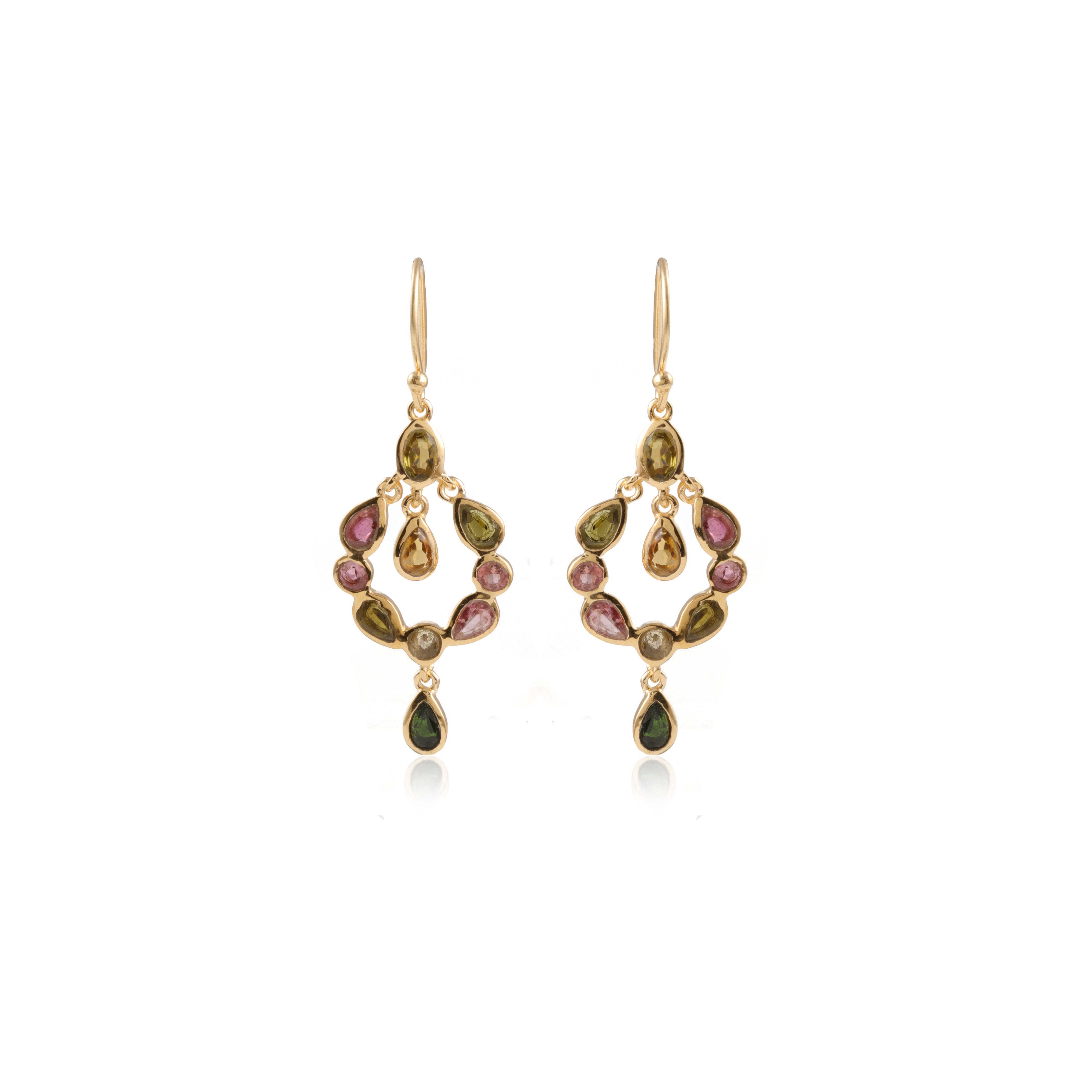 Our Dream Catcher earrings are captivating. They have an oval design with eight tourmaline stones in circular and teardrop shapes, finished with a teardrop stone hanging in the center and at the bottom.