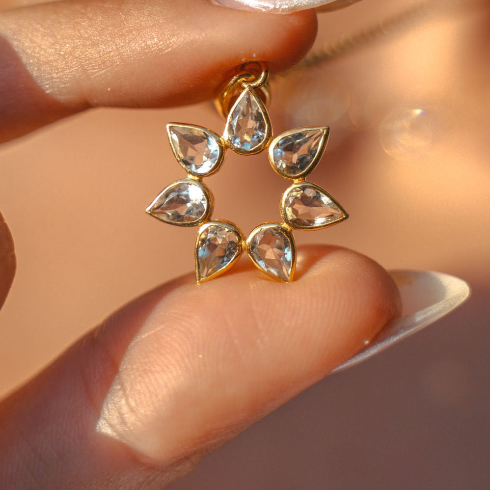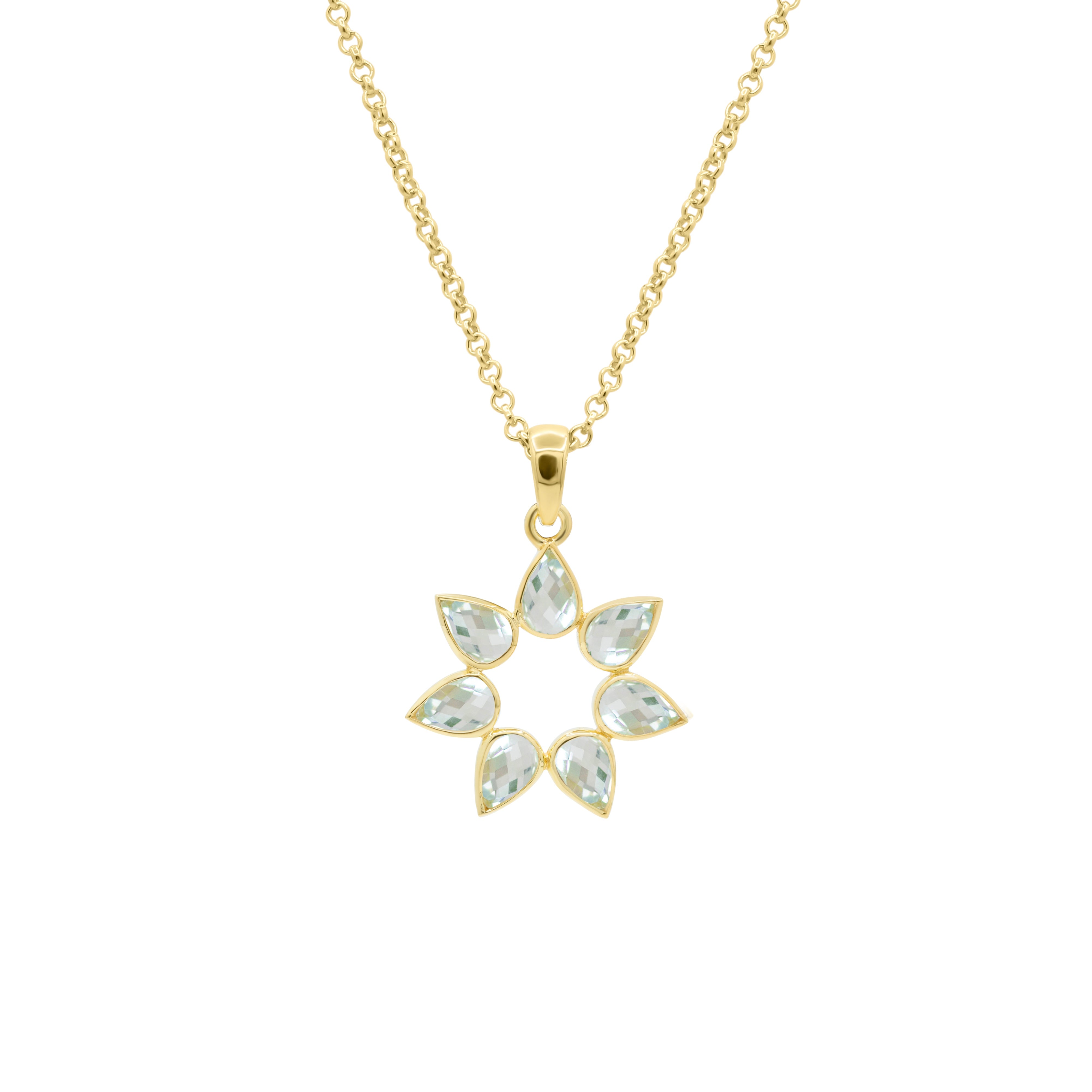 Seven petal shaped gemstones create this perfect pendant, reflecting the joy of nature and the power of the flower! You will never want to take it off!