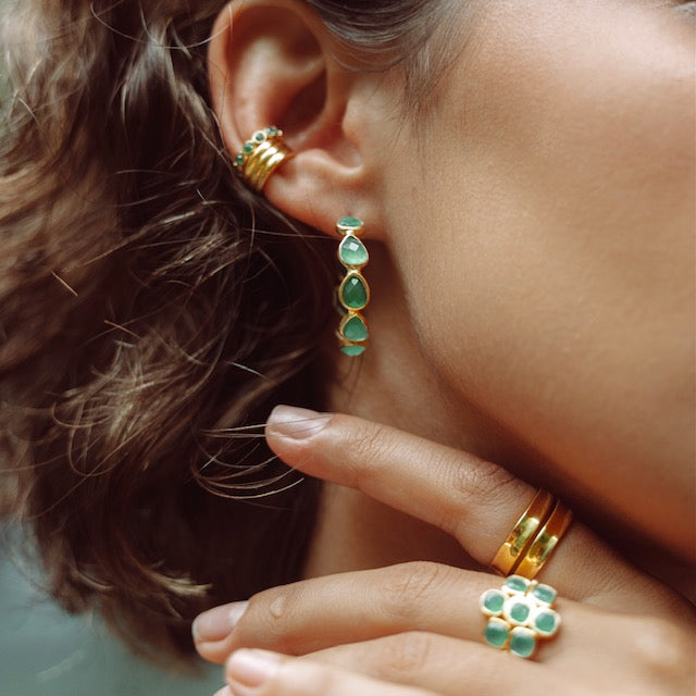 This stunning cuff is a semi circle of eleven green zirconia stones. It's simply beautiful making any ear the definition of chic.