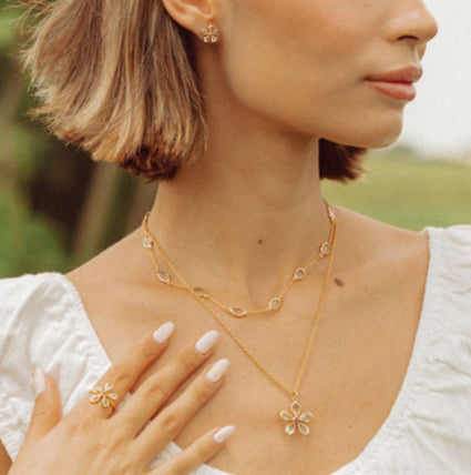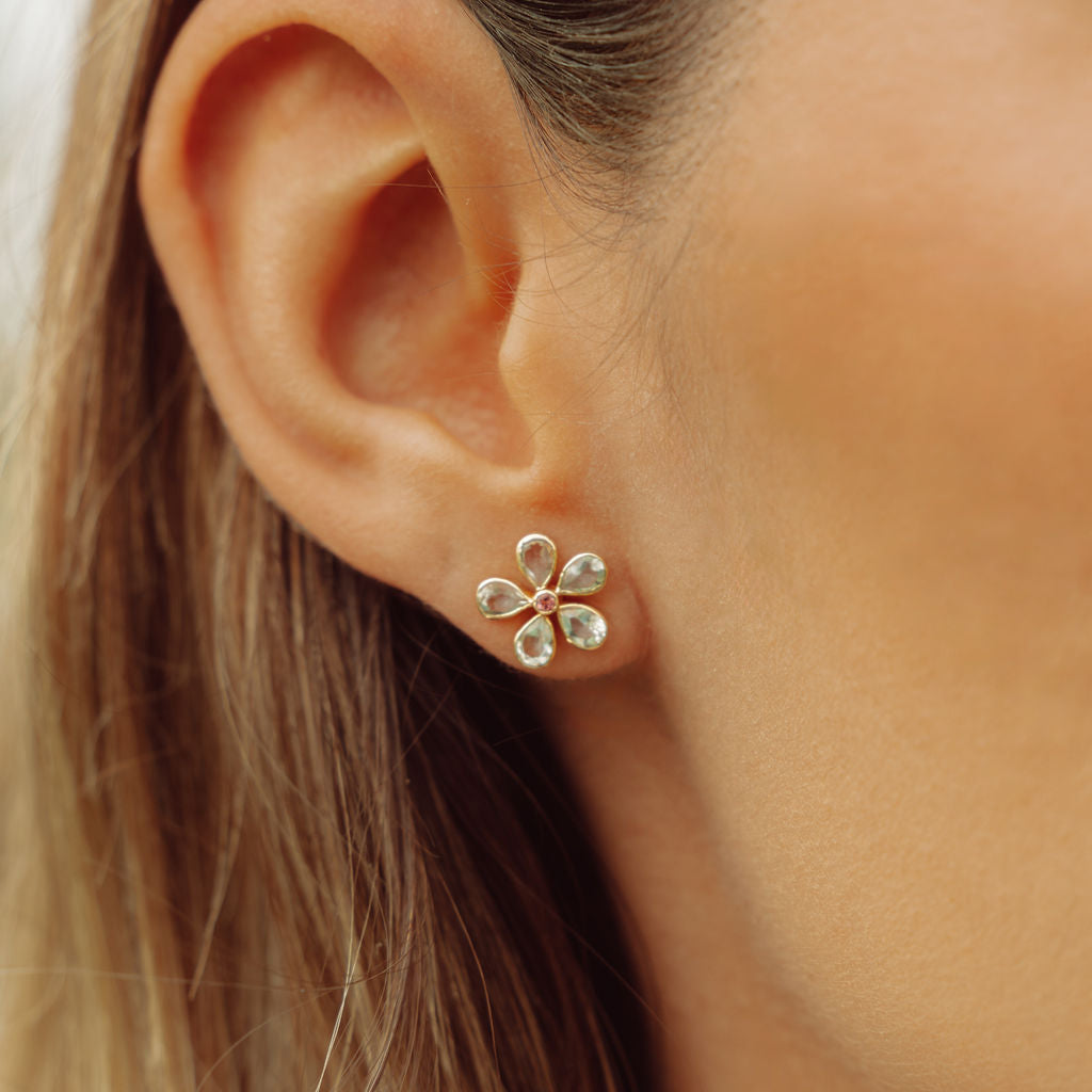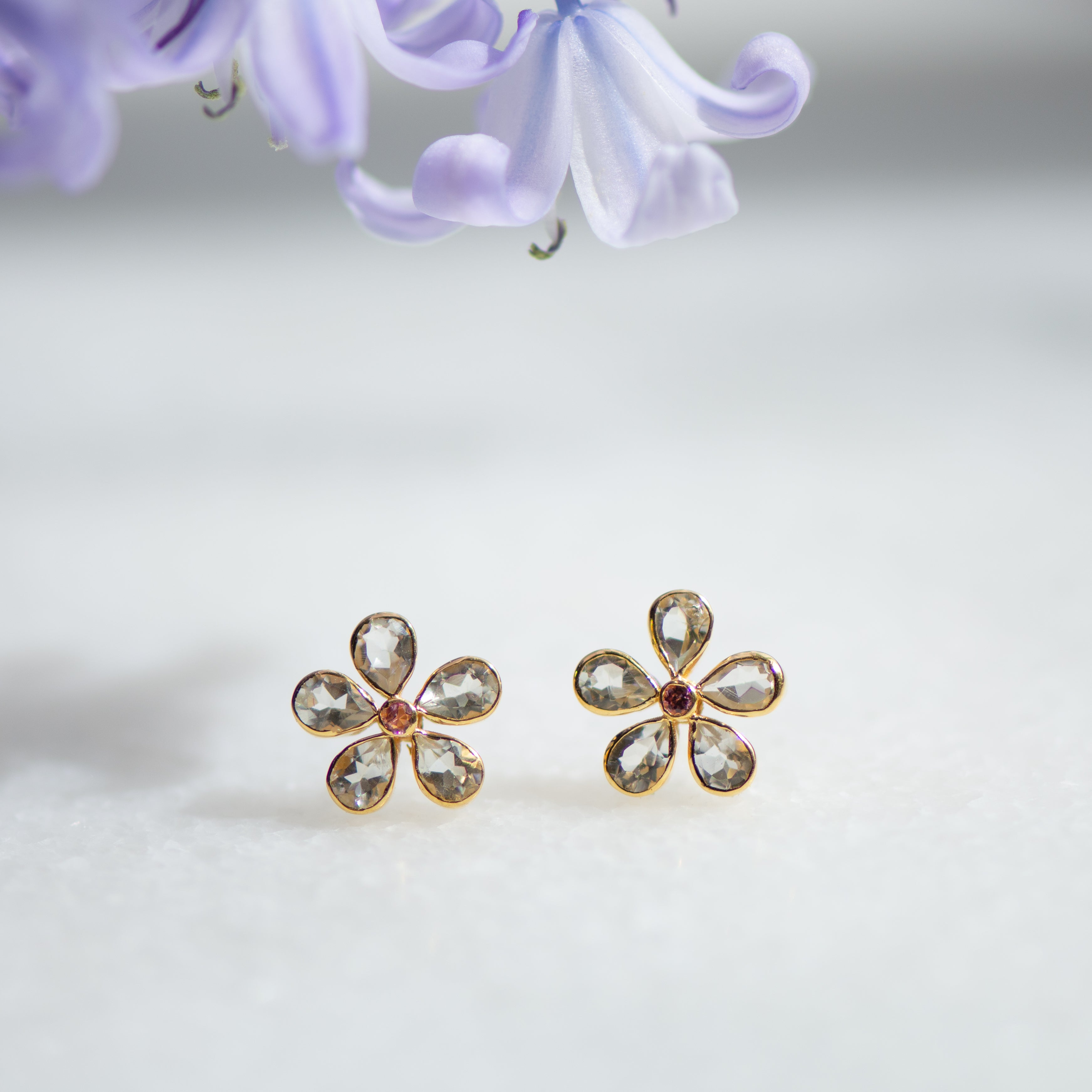 If you love flowers - you will love this duo! A delicately hand crafted pendant with five pear shaped green amethyst gemstones surrounding a circular pink tourmaline with matching daisy studs.