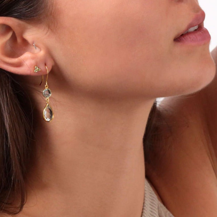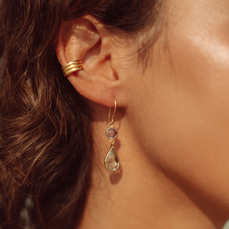 Deliciously elegant droplet earring with two contrasting stones. Hung from an ear loop.