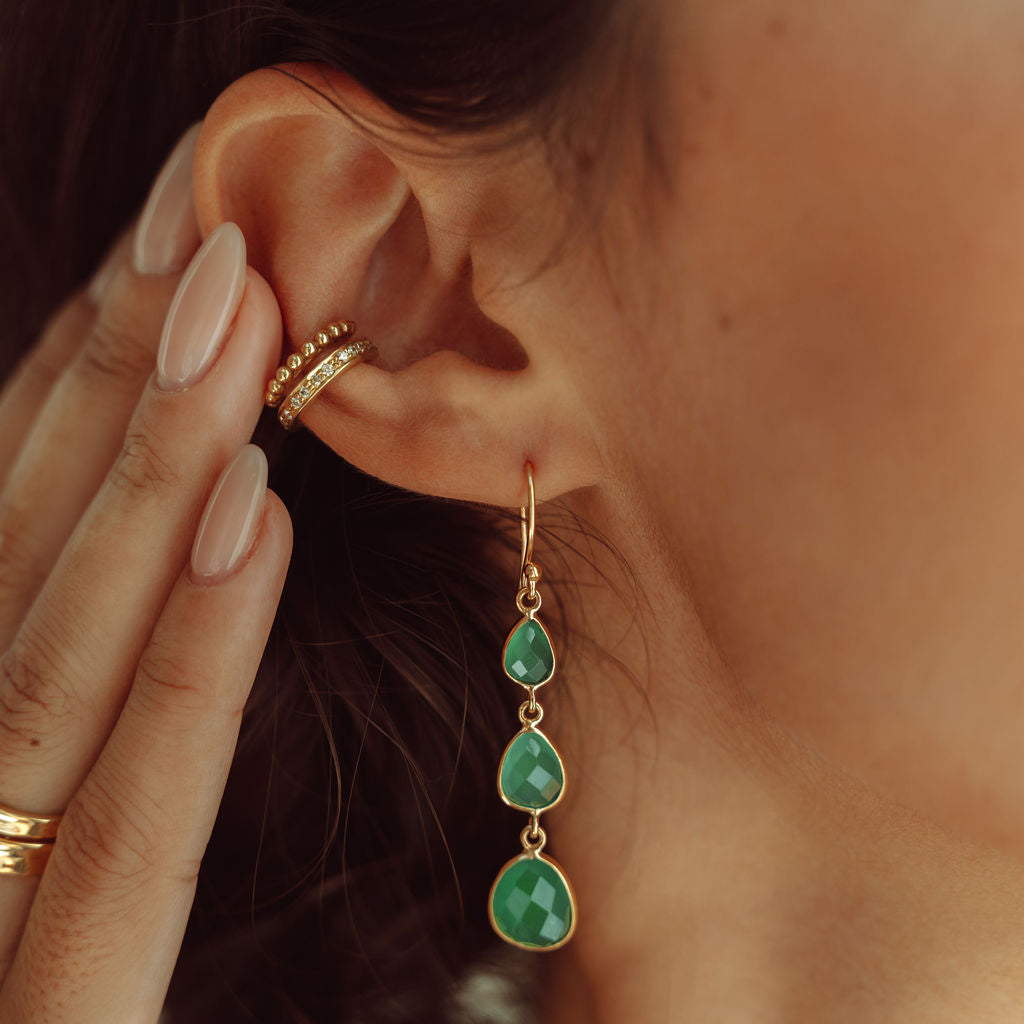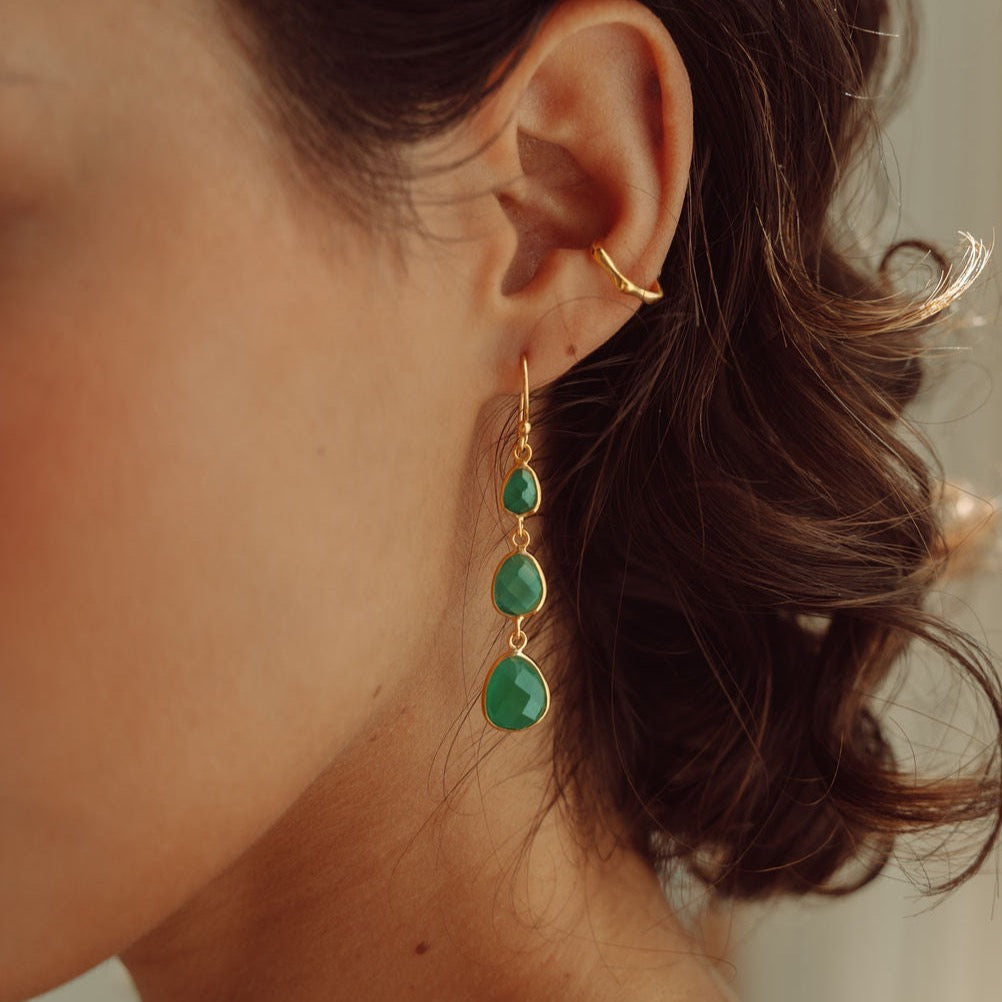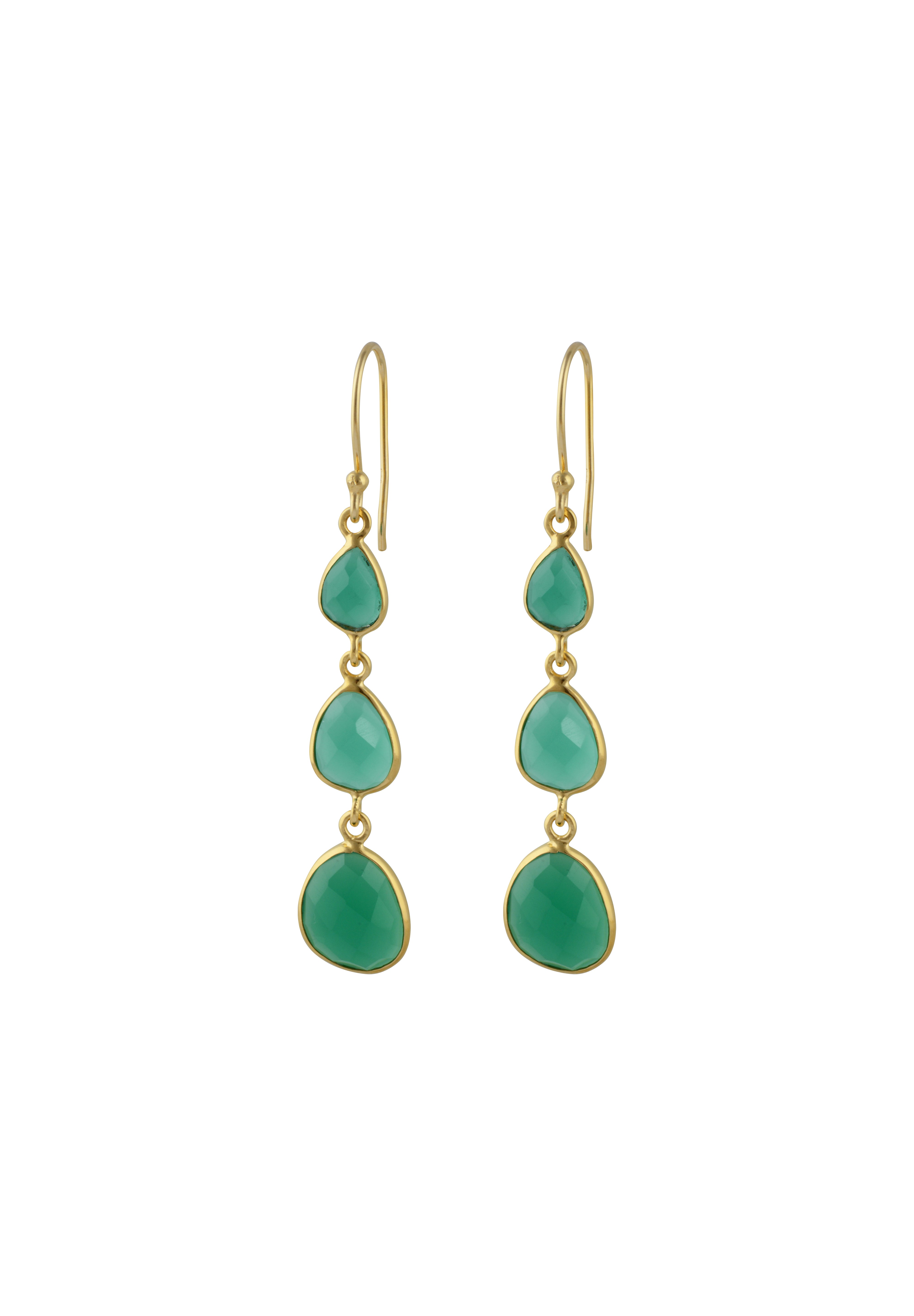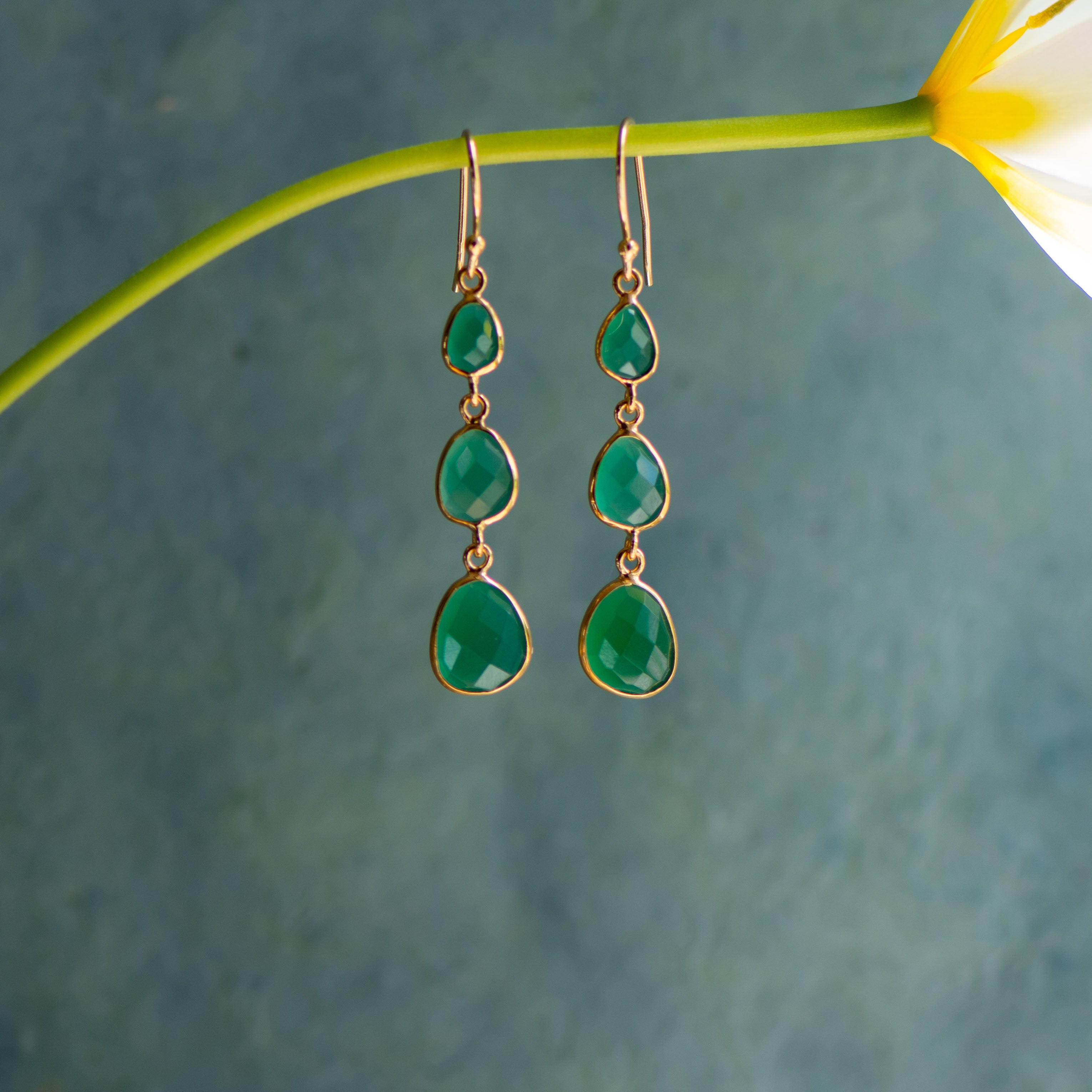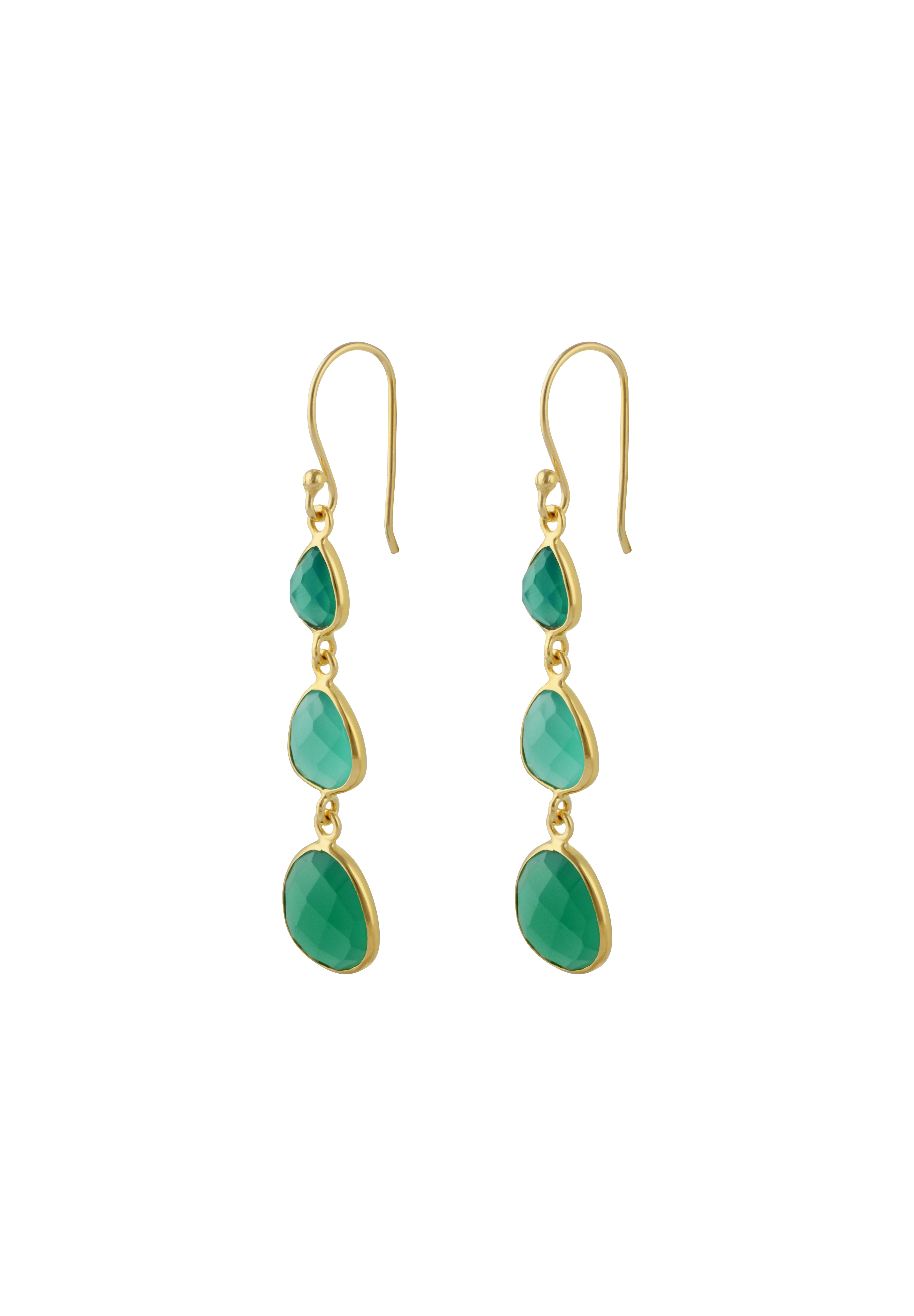 Three shimmering organic shaped gemstones ascend in size, creating these elegant earrings.