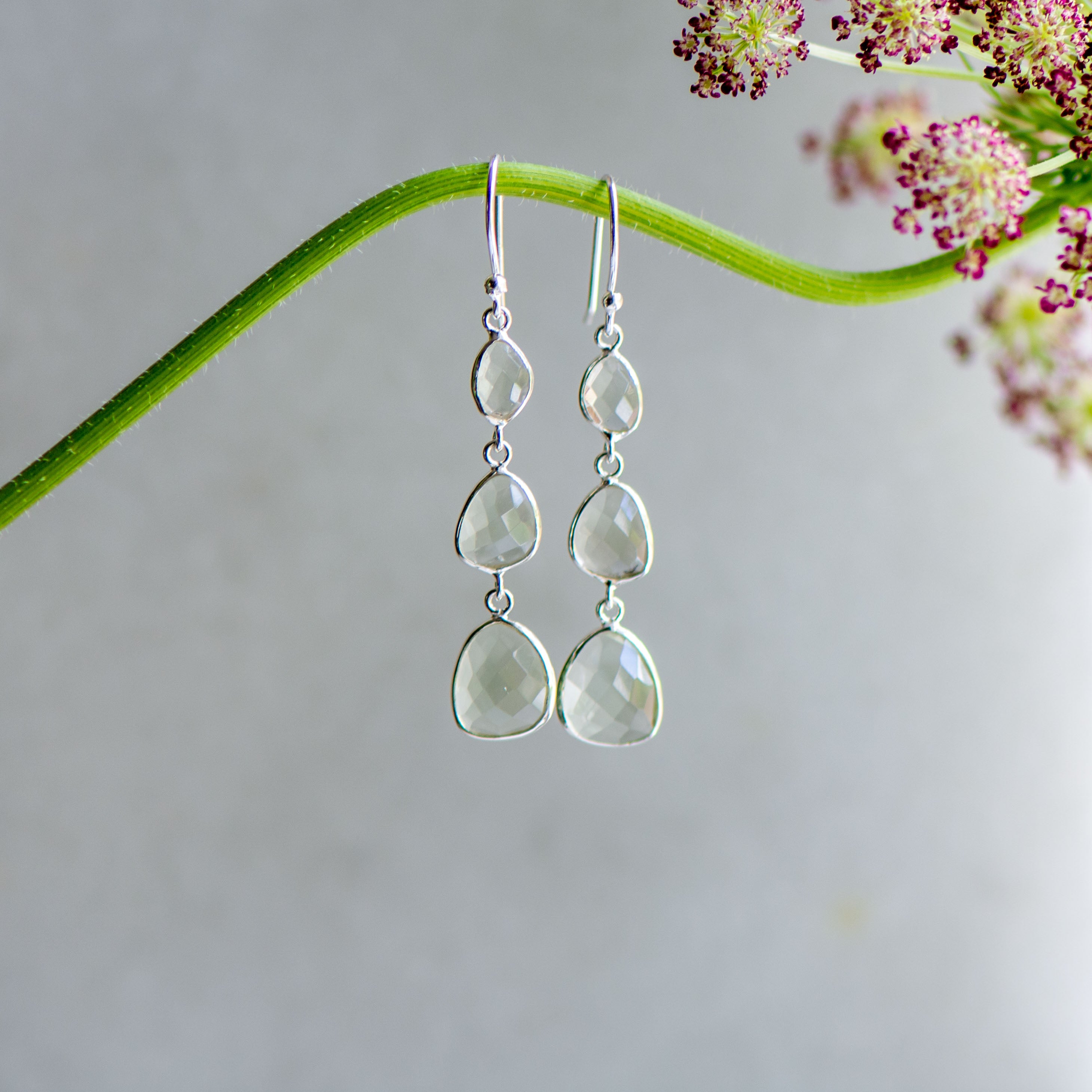 Three shimmering organic shaped gemstones ascend in size to create these elegant earrings.