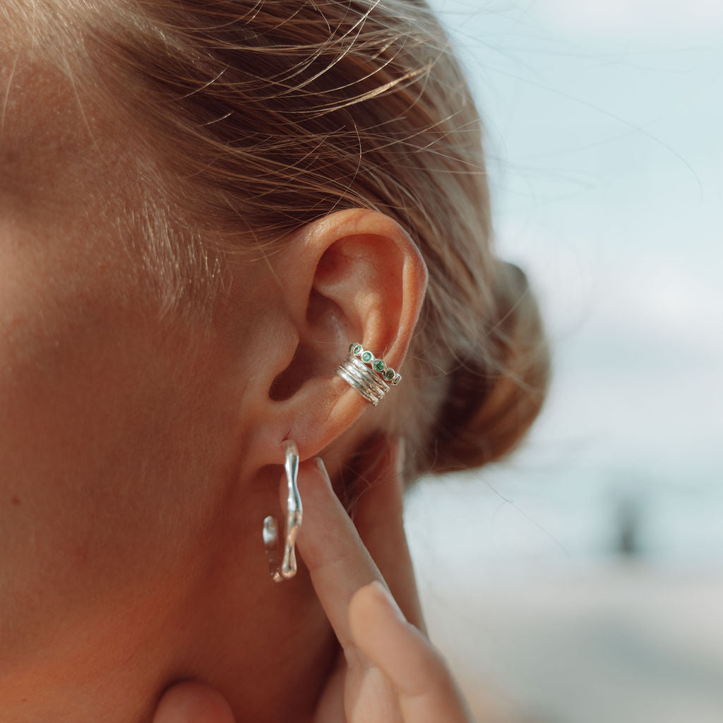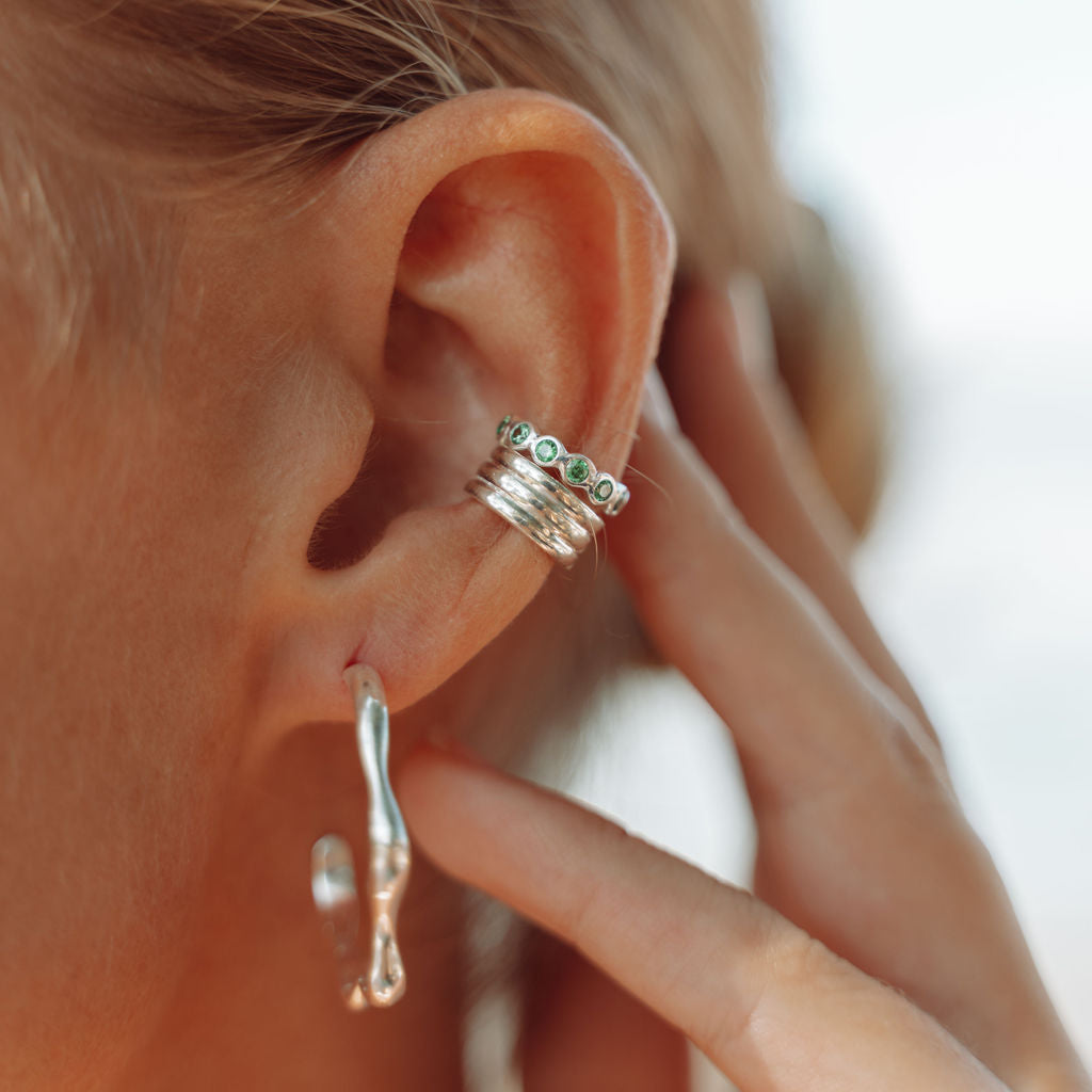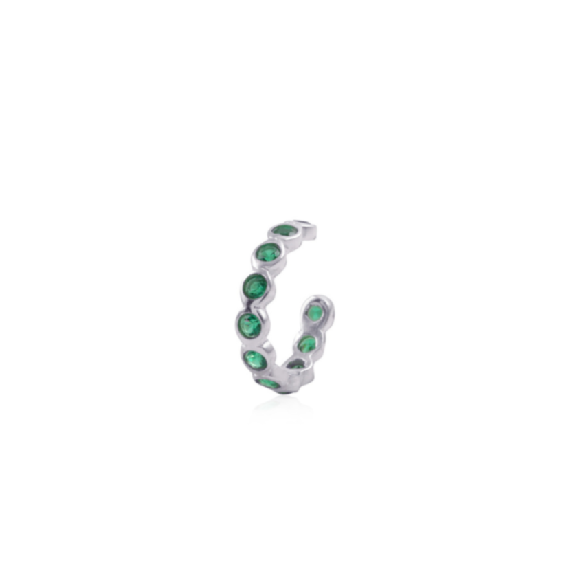 This stunning cuff is a semi circle of eleven green zirconia stones. It's simply beautiful making any ear the definition of chic.