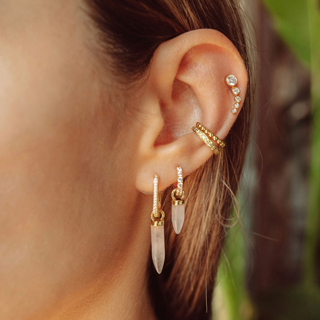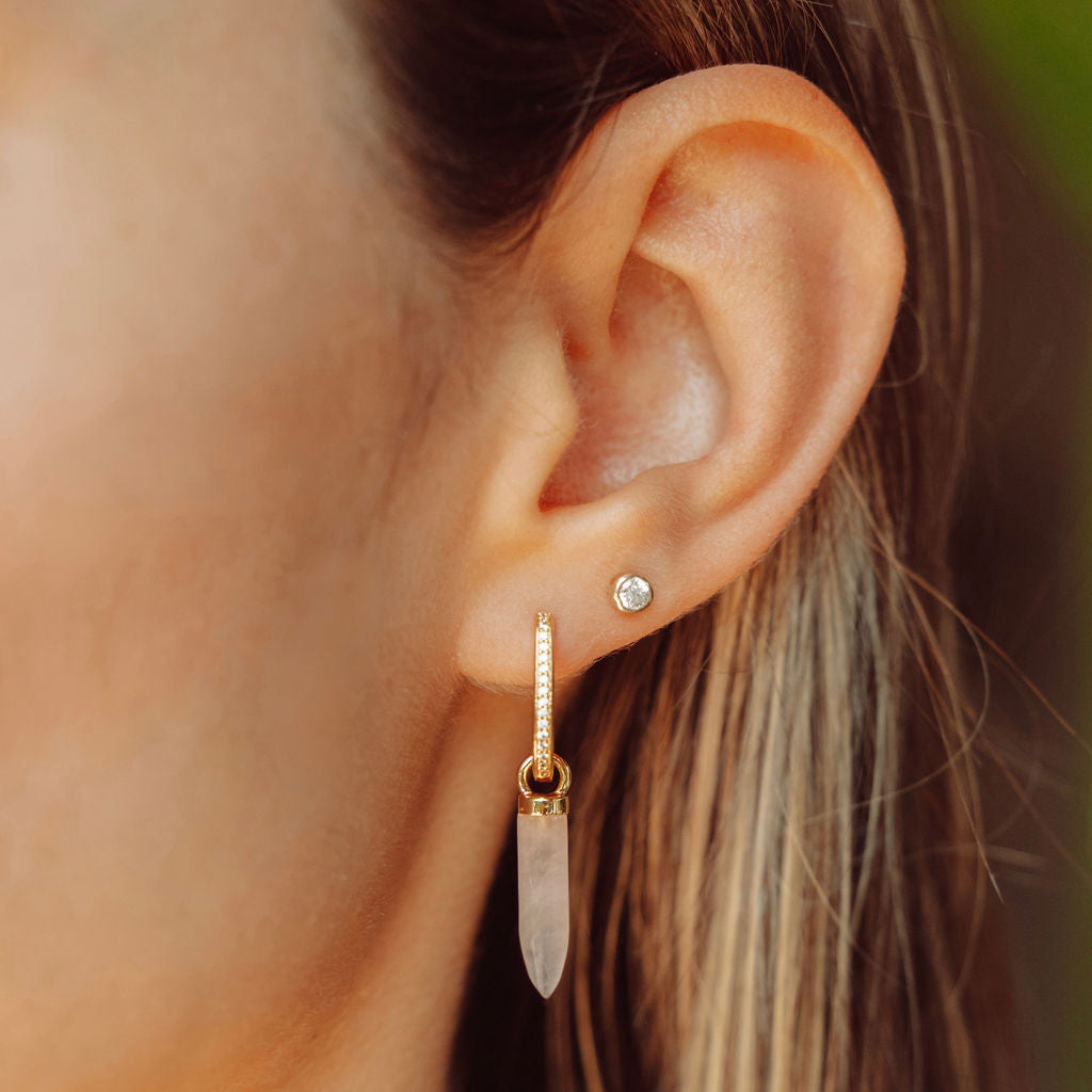 An elegant rose quartz drop that not only looks beautiful when the light shines through it but is also known for its healing qualities and believed to emit strong vibrations of love. The perfect addition to any ear stack!