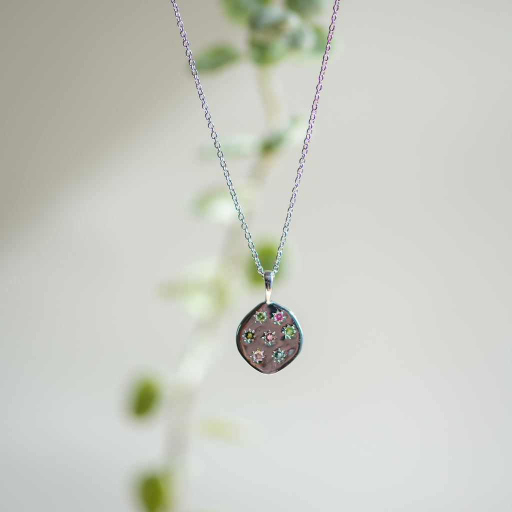 A tactile, organic oval with seven dazzling tourmaline gemstones. An everyday beauty that reminds us of nights spent gazing at the stars. Paired with the matching earrings it makes the perfect set!