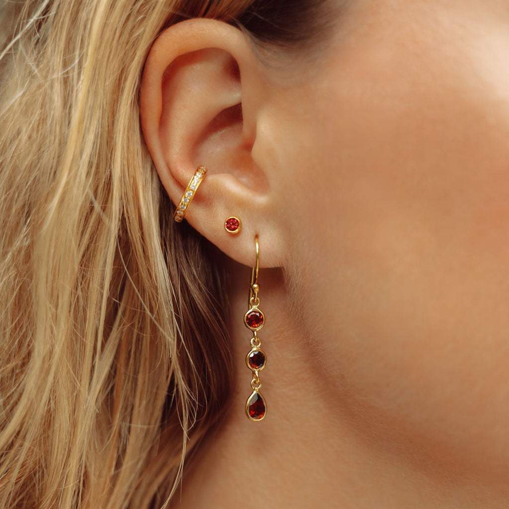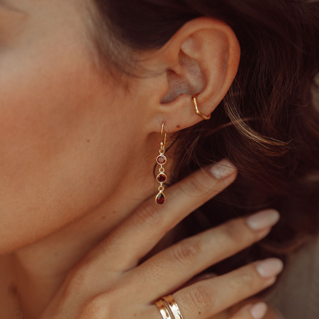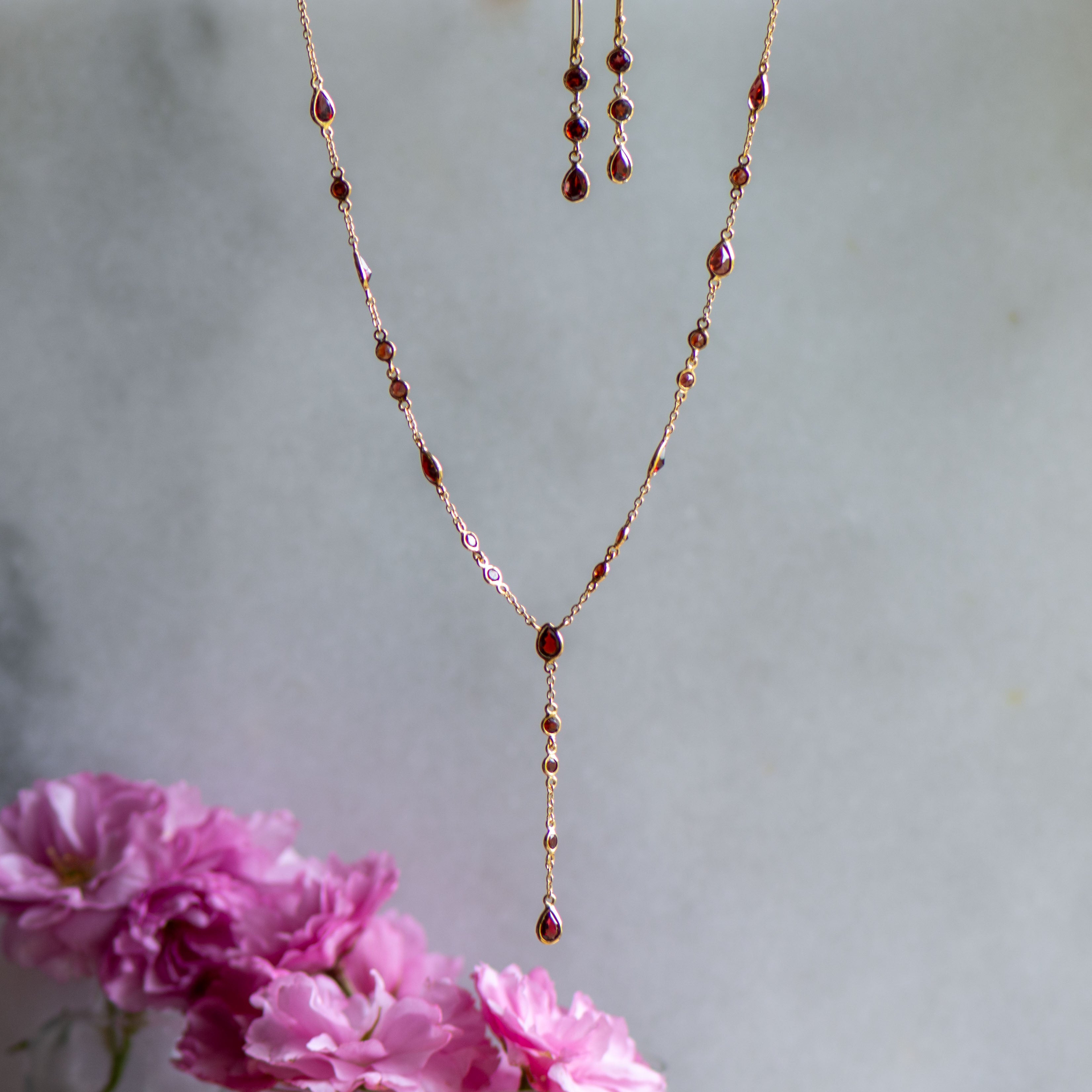 Our Y drop necklace is an elegant and flattering edition to any outfit. Featuring twenty one pear and circular Garnet stones it can be perfectly positioned with an adjustable chain. Pairs beautifully with our Triple drop earrings.