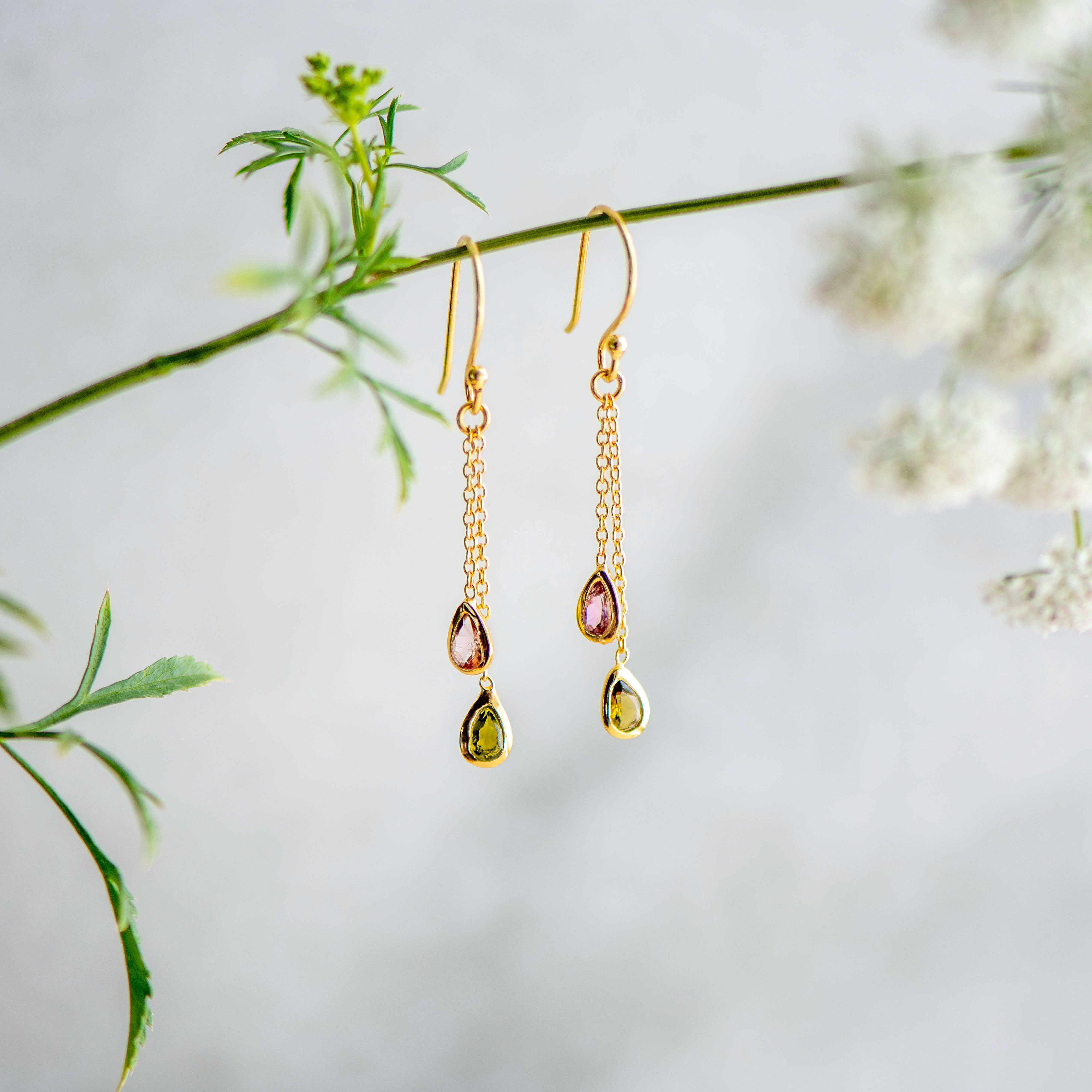 A Short and beautifully flattering necklace, the tourmaline necklace is made up of fourteen circular gemstones in pink, green, yellow and blue. Each necklace combination is slightly different. Perfectly Paired with the dual earrings.